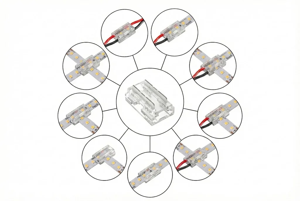 Złączka 9w1 działa jak inteligentny adapter, umożliwiając bezpośrednie i trwałe połączenie różnych rodzajów taśm, w tym SMD z COB z taśmy na przewód instalacyjny bez użycia cyny. Dzięki temu w kilka sekund możesz wyprowadzić zasilanie, stworzyć estetyczny mostek nad przeszkodą konstrukcyjną lub połączyć kilka różnych sekcji w jeden spójny system (L, T, X). Solidny zacisk gwarantuje odporność na drgania, a niski profil pozwala na domknięcie klosza w profilu bez zbędnych naprężeń i cieniowania.
